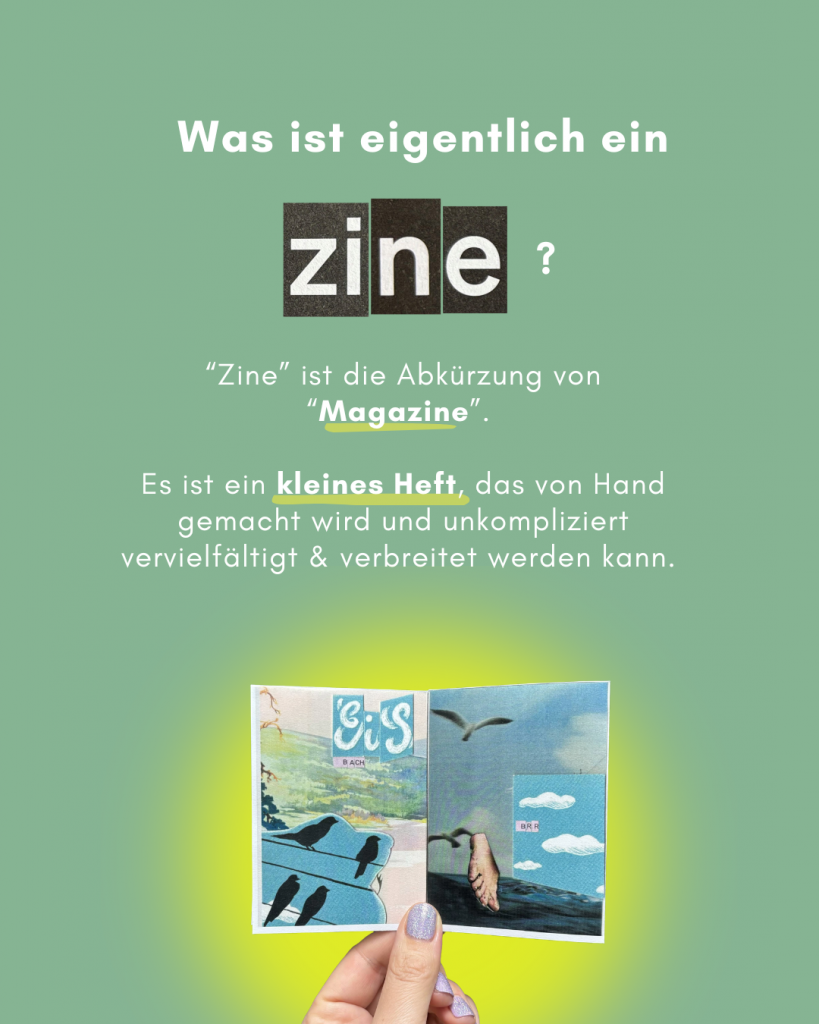 “Zine” ist die Abkürzung von “Magazine”. Es ist ein kleines Heft, das von Hand gemacht wird und unkompliziert vervielfältigt & verbreitet werden kann.