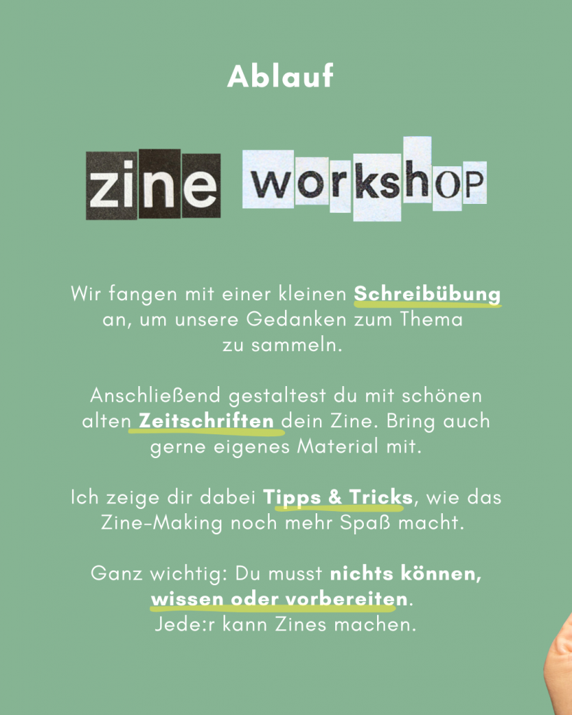 Ganz wichtig: Du musst nichts können, wissen oder vorbereiten. Jede:r kann Zines machen. Und am besten sind sie, wenn sie unperfekt sind 🙂