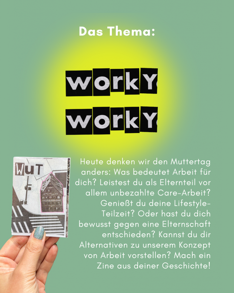Heute denken wir den Muttertag anders: Was bedeutet Arbeit für dich? Leistest du als Elternteil vor allem unbezahlte Care-Arbeit? Genießt du deine Lifestyle-Teilzeit? Oder hast du dich bewusst gegen eine Elternschaft entschieden? Kannst du dir Alternativen zu unserem Konzept von Arbeit vorstellen? Mach ein Zine aus deiner Geschichte!